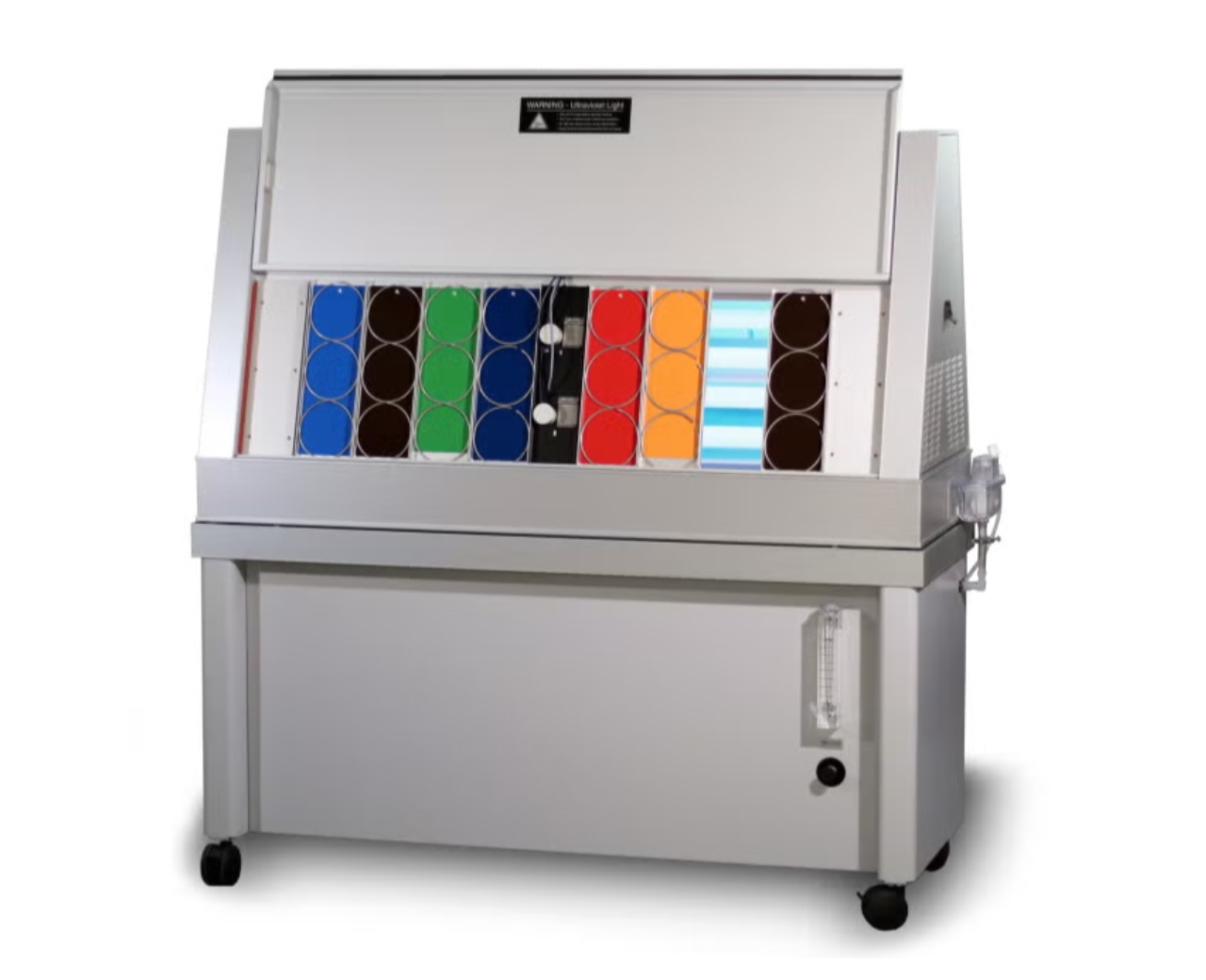 一些行業(yè)測試方法規(guī)定使用冷白色熒光燈進行室內(nèi)光穩(wěn)定性測試。為了重現(xiàn)這些室內(nèi)光照條件,QUV/cw 使用普通冷白色熒光燈。它有一個 SOLAR EYE 輻照度控制系統(tǒng),可以監(jiān)測和控制可見光輸出,而不是紫外線。